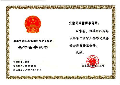 軍工涉密業(yè)務(wù)咨詢服務(wù)安全保密條件備案單位資格是咨詢服務(wù)機(jī)構(gòu)(含律師事務(wù)所)服務(wù)軍工企事業(yè)單位的前提資格條件。天禾所再次獲得該資格,系對天禾所為軍工涉密單位服務(wù)的肯定,也系對本所繼續(xù)服務(wù)好軍工涉密企事業(yè)單位的鼓勵和鞭策。